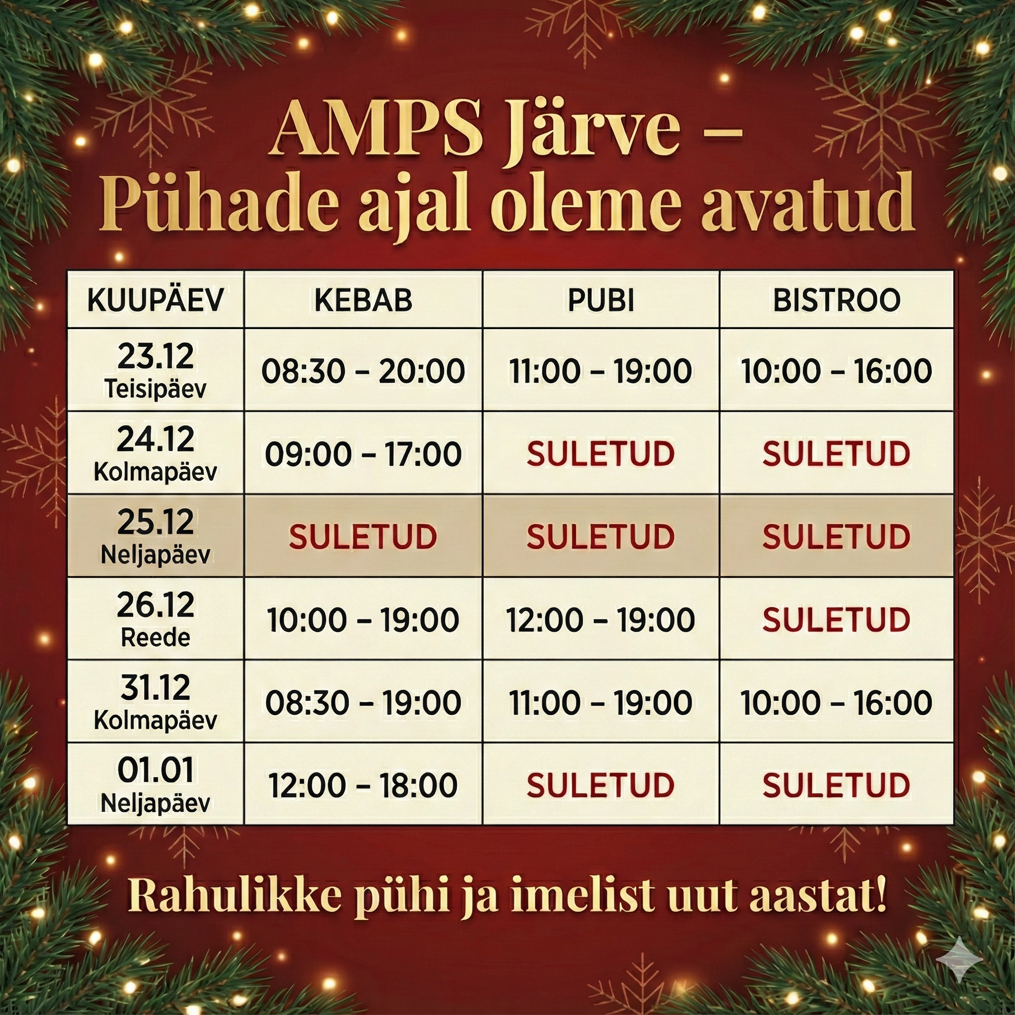 Jõulurahu südamesse, maitsvad ampsud kõhukesse! Pühad veeda pere seltsis, parimad hetked meie seltsis.