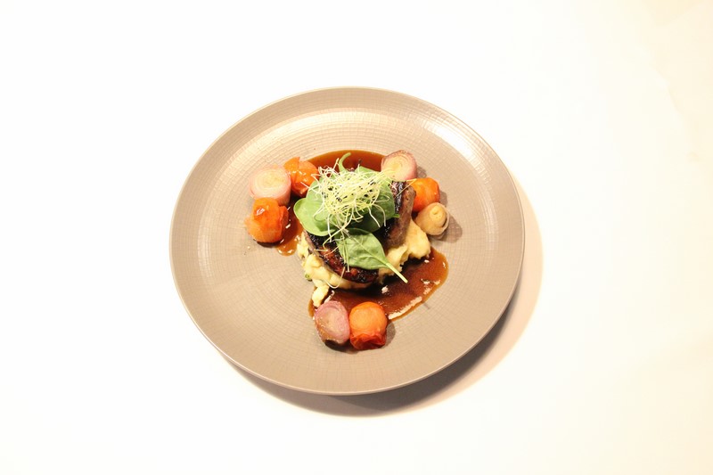 Ürdiõliga praetud vasikamaks, kartulipüree spinati ja parmesani juustuga, küpsetatud shallot sibulate ja praekastmega (L)