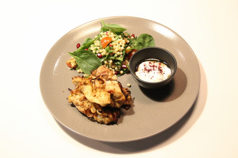 Sidruni ja mündiga marineeritud kanašašlõkk, pärlkuskussi salat värskete ürtide ja granaatõuna seemnetega, Kreeka jogurtikaste